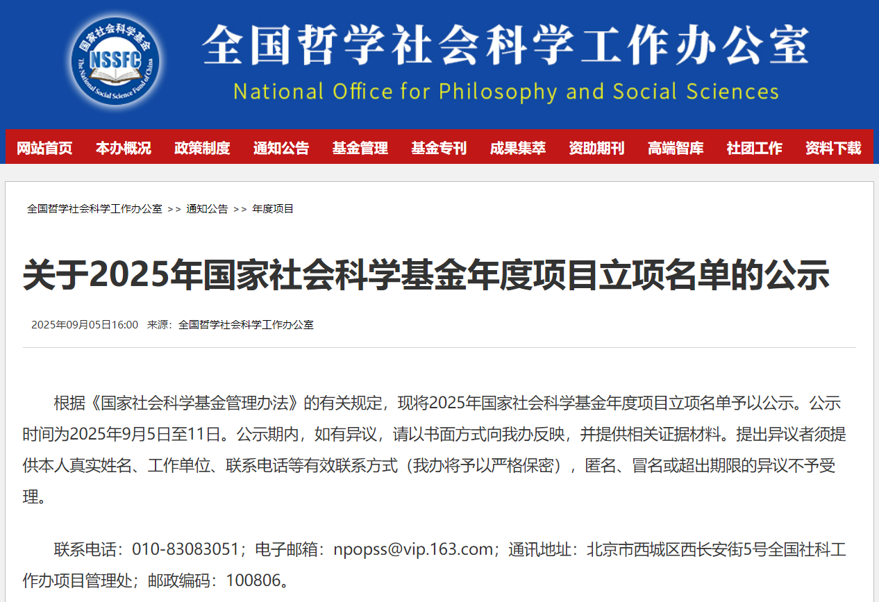 9月5日,全国哲学社会科学工作办公室发布了“关于2025年国家社会科学基金年度项目立项名单的公示”,新葡的京官网张国珍副教授申报项目获批(见下表),占全校立项总数的33.3%。