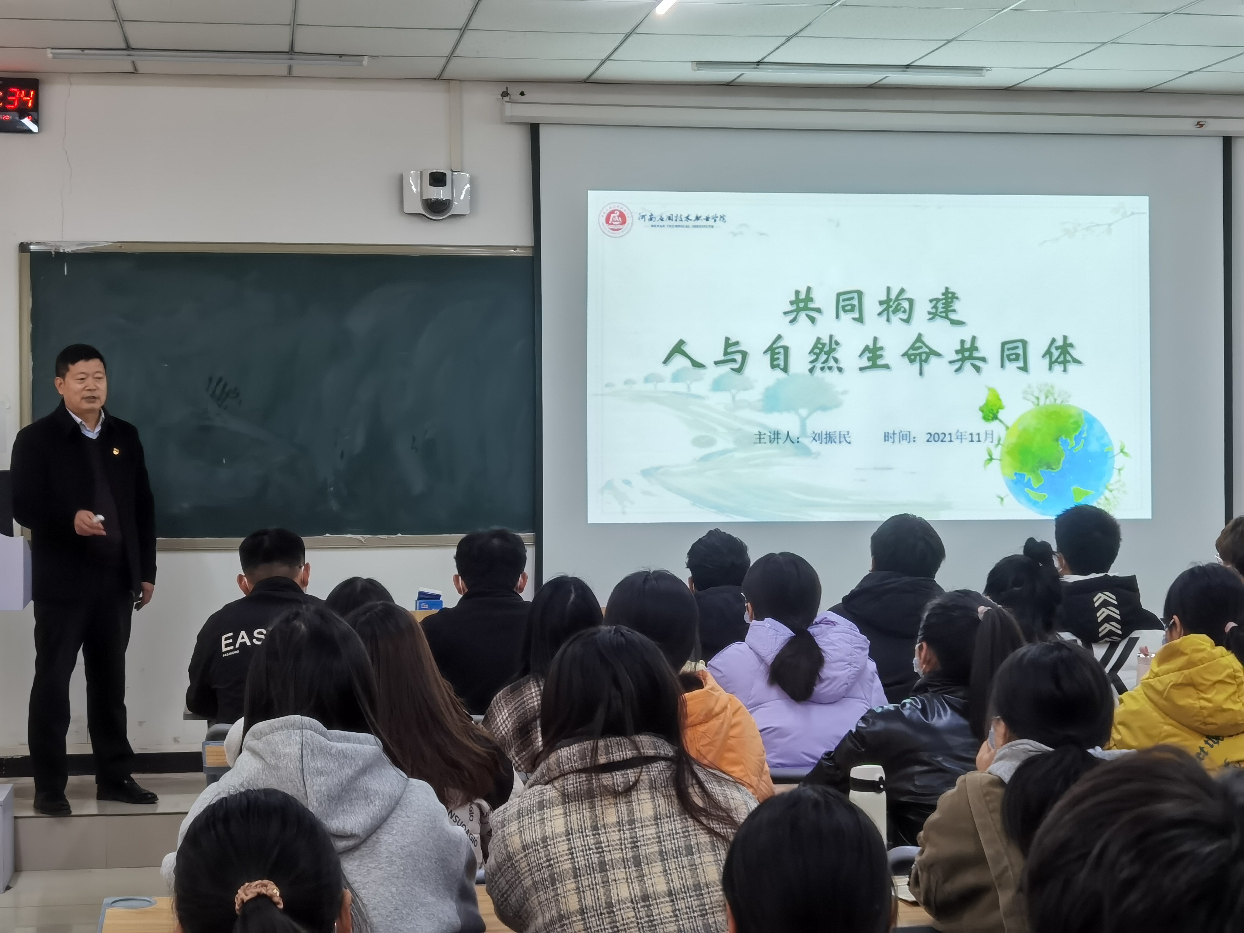 刘振民从当下全球环境治理面临的挑战入题,用一系列生动详实的数字和实例向同学们展示了人类目前遭遇的环境问题的严峻性,引发了同学们对于推进生态文明建设,实现人与自然和谐共生重要性和迫切性的思考。随后,他从构建人与自然生命共同体的主要方案和大国担当等方面,阐述中国的减碳之诺,深入打好碧水蓝天保卫战、净土战等重大举措的实施,告诉同学们中国以实际行动做全球环境治理的行动派,展现了中国在全球环境治理中所展现的大国担当。同时也结合身边实例,如郑州720事件后学校所展现的应院速度和奋战在抗洪防疫一线的师生志愿者的事迹鼓励大家。他告诉大家这既是一道关于人与自然关系的思考题,也是践行奉献与担当精神的实践题。