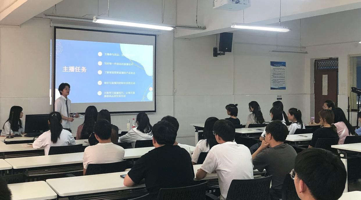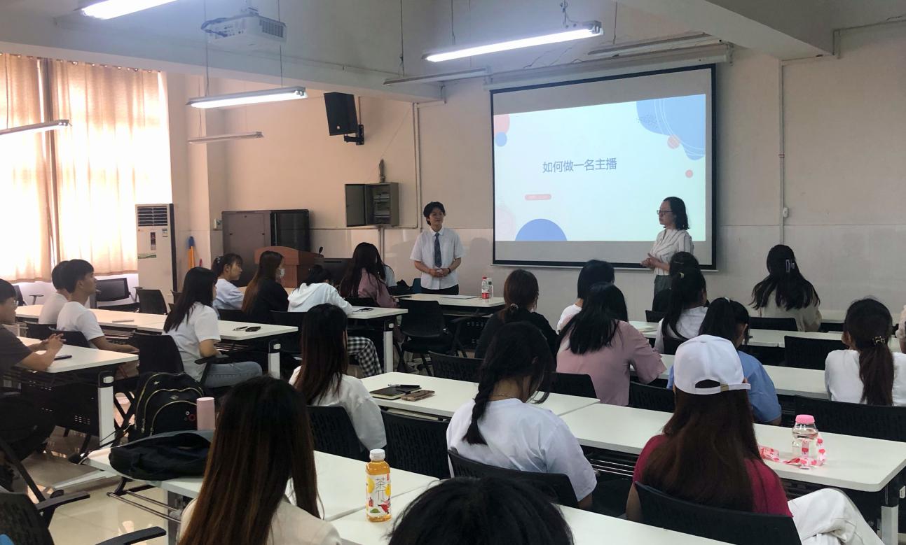 为满足企业对直播人才的需求,提供精准人才服务,多形式、多渠道探索电商主播人才培训模式,提升主播销售专业素养,壮大电商直播人才队伍,Beat365中文官方网站电商工作室于5月27日下午在E602开展了电商直播培训。本次活动邀请了来自海一云商的优秀老师,他给同学们进行了一场“如何成为一位优秀主播”的主题培训,Beat365中文官方网站网络营销、电子商务等专业的同学参加了培训。