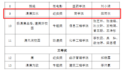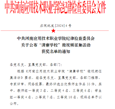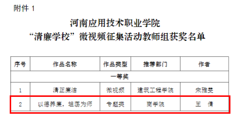 近日,学校纪律检查委员会下发了《Beat365中文官方网站“清廉学校”微视频征集活动》的通知,经过专家评审、网络投票等环节,最终我院师生拍摄的清廉作品获教师组一等奖专题类1项,学生组二等奖专题类1项,纪实类1项。