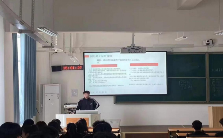 本次主题团课由21级、22级各班团支部书记主讲。主要介绍内容有:关于中国共产主义青年团纪律处分条例的内容,团内纪律处分的种类,以及团内纪律处分的运用规则等。让同学们了解了自觉遵守团的纪律是共青团组织对每个团员的基本要求,每个共青团员都应该认真学习团的纪律,加强自身修养。