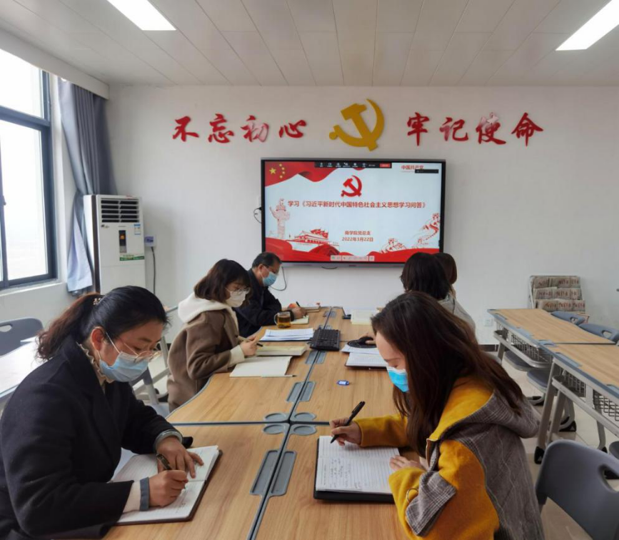 2022年3月22日下午,Beat365中文官方网站组织全体教师政治理论学习及研讨。会议学习了《习近平新时代中国特色社会主义思想学习问答》之思想之旗领航向。根据疫情防控需要,会议以视频方式进行,学院管理干部在主会场办公楼504参会,其余教师通过钉钉视频参会。会议由党总支书记周燕主持。
