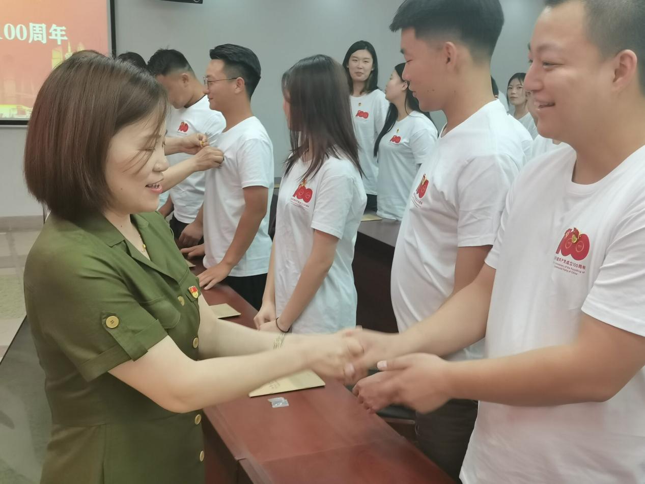 随后,全体教师党员为新党员佩戴了党员党徽。面向党旗,64名新党员举起右拳,用响亮的誓言表达了自己在建党百年之际加入党组织的激动心情和为党和国家奉献终身的决心和坚定的信念,老党员也在重温入党誓词中进一步坚定初心使命。