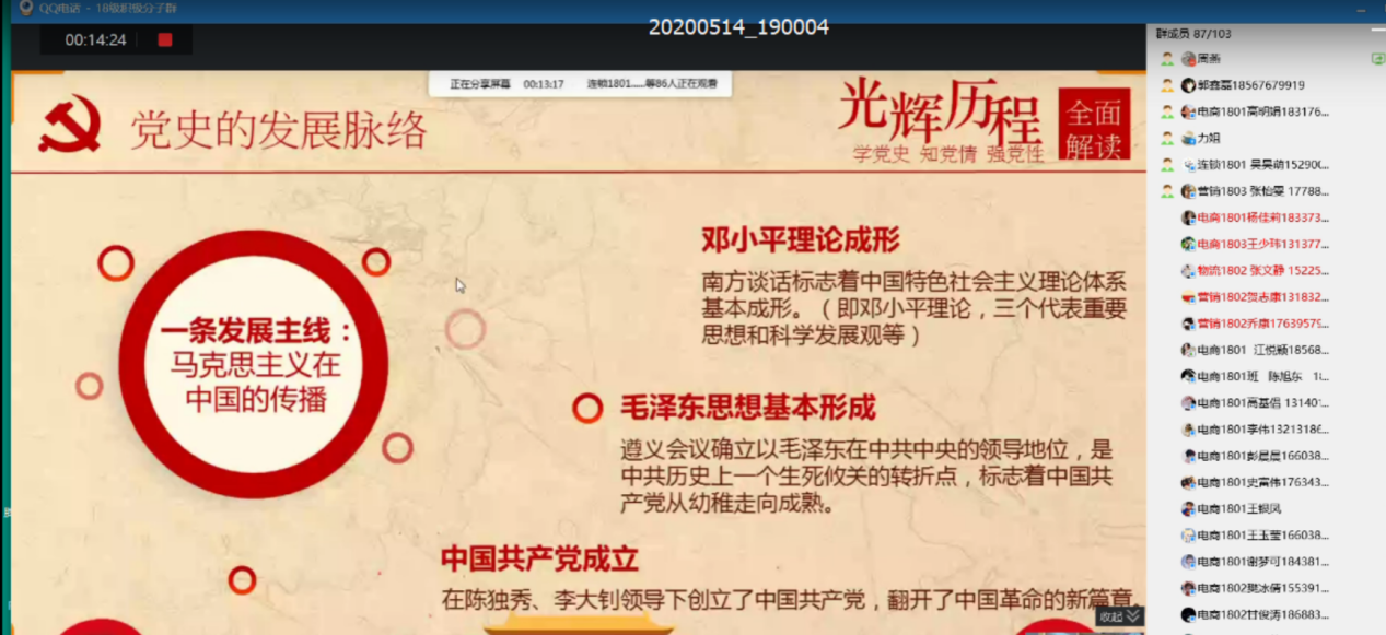 本次培训以线上方式开展,周燕老师以学习中共党史为主题,以党的历次代表大会作为脉络,讲述了我们伟大的中国共产党在三个不同历史时期的组织建设和发展状况、党领导全国各族人民进行革命和建设的发展历程。通过学党史、知党史,以史为鉴,引导广大青年积极分子进一步坚定理想信念,牢记党的宗旨,增加对党的情感认同,也学会从党史中汲取精神之钙,汲取理论之魂,汲取奋进之力,汲取为民之情。