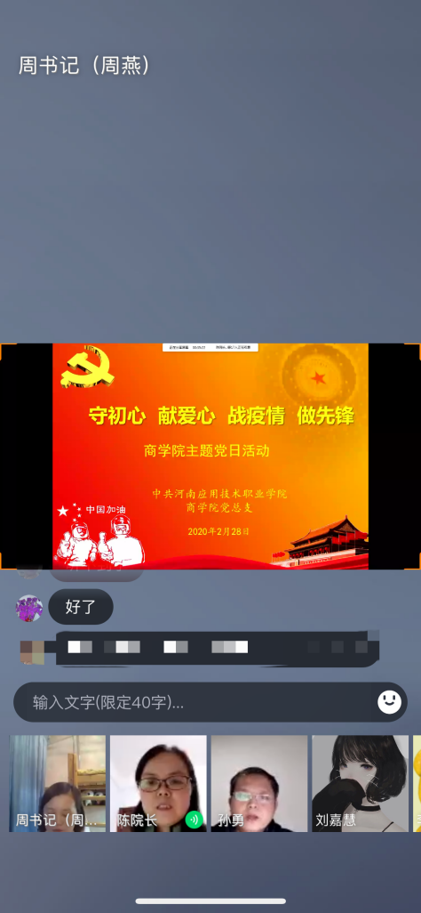 2月28日晚上,Beat365中文官方网站全体党员同志以网络视频的形式召开了一次特殊的主题党日活动。此次党日活动是积极响应习近平总书记关于新型冠状病毒感染肺炎疫情防控系列重要指示批示精神,充分发挥好疫情防控期间基层党组织战斗堡垒作用和党员先锋模范作用,根据学校《关于组织开展“守初心、献爱心、战疫情、做先锋” 线上主题党日活动的通知》召开的。学校党委委员陈君丽同志作为支部成员全程参与主题党日活动。周燕副书记主持活动。