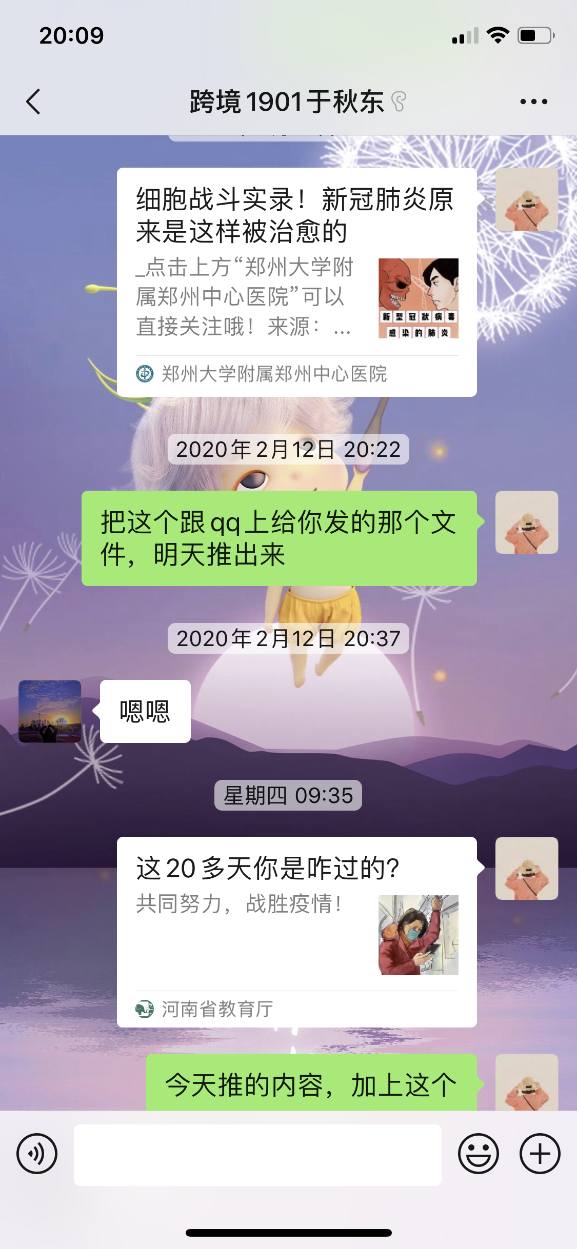 她是总支的宣传委员,经历了最初获悉疫情蔓延态势的恐慌、不知所措到淡定的接受。她知道这时候负责宣传工作的她要勇于发声,引导大家对疫情有一个正确的认识。从大年三十晚上开始,每天浏览各大网站,收集官方媒体发布的防护措施和疫情动态,撰写新闻稿,编辑后通过公众号对全体师生推送,引导师生科学防控,不信谣,不传谣。截至手稿之日,已累计发送信息40余条。