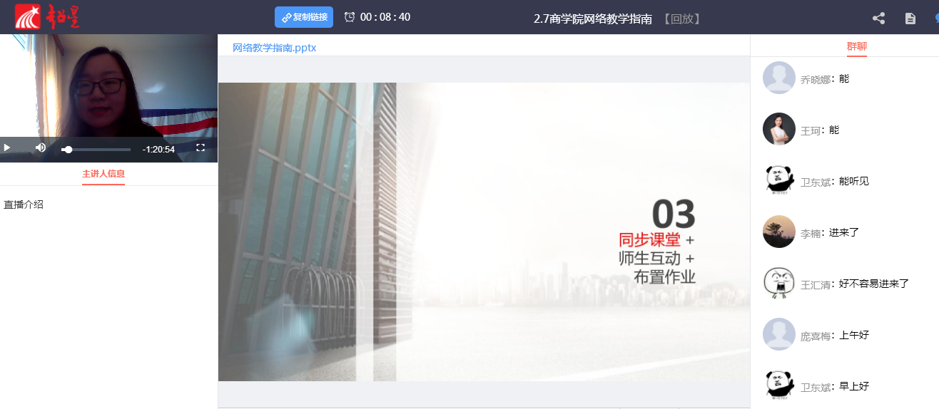 2月7日,吴老师给Beat365中文官方网站全体教师做了一堂持续了1个半小时的直播公开课,培训讲解了3种主要的授课模式:直播模式、微课/速课模式、同步课堂模式,Beat365中文官方网站教师积极参与答疑,提出了很多网络教学中遇到的问题,吴老师进行了一一解答。总结经验之后,吴老师重新撰写了《教学指南2.0》和《学生学习指南1.0》,分享在Beat365中文官方网站QQ群。