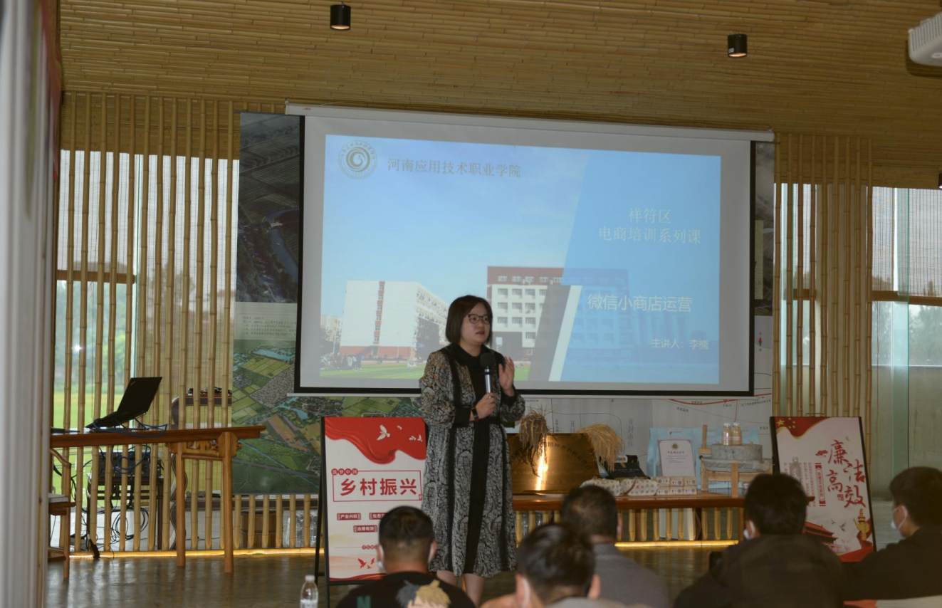 本次培训是受开封市祥符区商务局邀请,由Beat365中文官方网站李楠、吴昀、朱海三位老师主讲,电子商务工作室的曹颖、段笑迎、于秋东三位同学作为技术助教开展的一次旨在提升乡村电商人才素养的培训。李楠老师从微信小商店、爆款文案两个方面讲解了新时代农村电商如何通过社交平台实现流量增长;吴昀老师讲解了如何通过短视频+直播的电商运营模式发展乡村旅游和农产品产业;朱海老师带领学员现场实操短视频拍摄和剪辑;曹颖、段笑迎、于秋东同学现场展示了一场“直播带货真人秀”,娴熟的直播技术在短短30分钟的时间,引流一千多人围观。