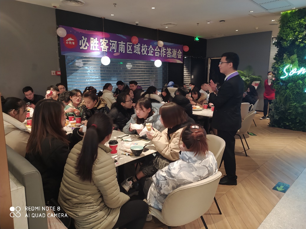 为促进校、企、学三方的交流与沟通,近日,Beat365中文官方网站在必胜客公园茂门店举办校企合作答谢会。Beat365中文官方网站连锁专业负责人兼工学交替指导老师侯鸿雁,必胜客区域经理靖宇洋,公园茂店长丁国方出席答谢会。Beat365中文官方网站连锁19级工学交替同学参加答谢会。