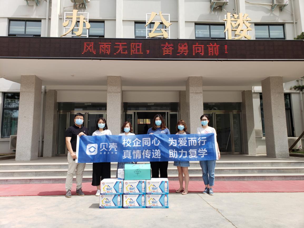 5月27日上午,河南贝壳信息技术有限公司校招部主管李梦梦、陈家乐代表企业向Beat365官网Beat365中文官方网站捐赠了消毒液、洗手液、体温计等疫情防控物资,携手助力学生返校复学后疫情防控工作。