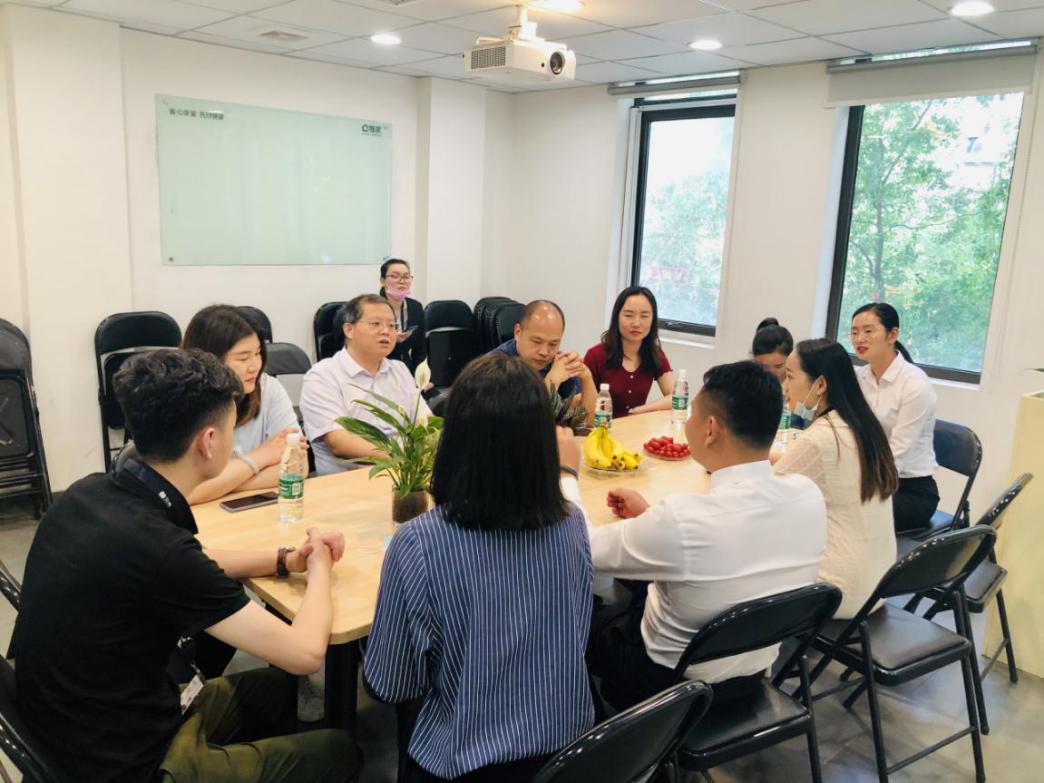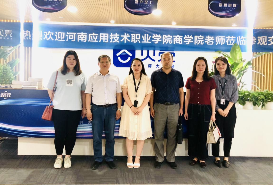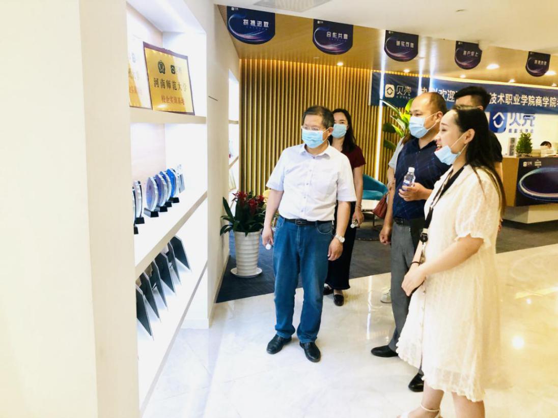 2020年5月19日下午,Beat365中文官方网站院长孙勇、招生就业处副处长李向民、办公室主任刘嘉慧、教务办公室主任王珂一行四人到贝壳河南总部调研参观,洽谈校企合作事宜。