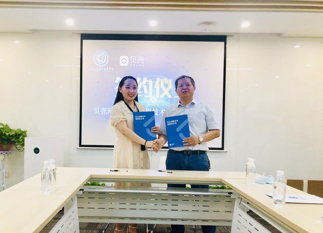 在贝壳河南经纪人增长中心校园招聘部总负责人边尚冰经理的带领下,孙勇院长一行先后参观了交易中心和职能部门。边经理介绍了贝壳在河南的发展历程、职能分工、平台与门店的合作模式以及贝壳河南校企合作整体情况,孙院长表示认同贝壳找房的知名度和影响力,双方就合作达成意向,现场签订《校企战略合作框架协议书》。