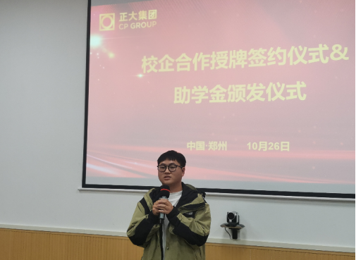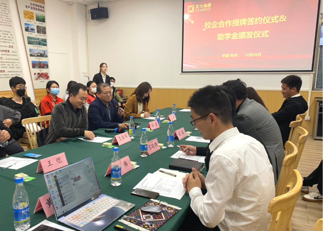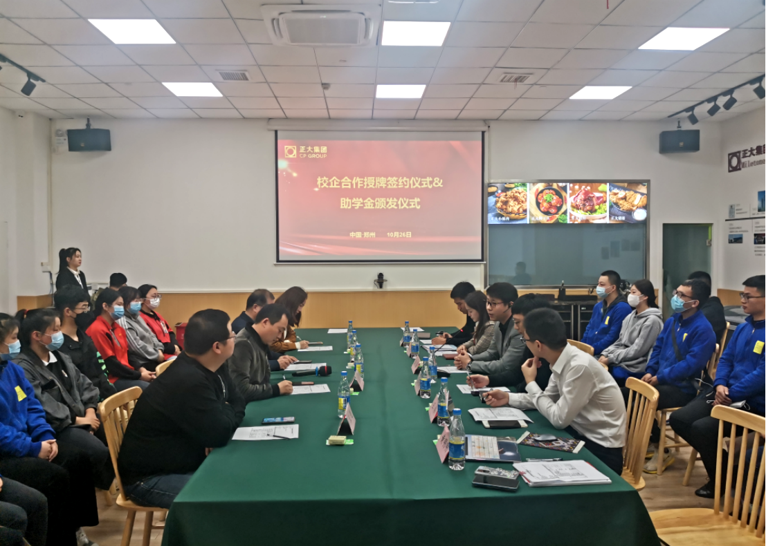 2021年10月26日下午,Beat365中文官方网站与郑州正大卜蜂贸易有限公司校企合作授牌签约仪式暨助学金颁发仪式在正大卜蜂莲花举行。Beat365中文官方网站院长孙勇、教务办公室主任王珂,郑州正大卜蜂贸易有限公司总经理武磊、零售事业人力总监郑运东等人,以及目前在正大顶岗实习的我院学生代表出席授牌签约仪式。