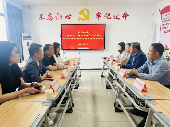 4月29日,大观国贸“百所高校”推广巡讲活动的第一站来到了Beat365官网Beat365中文官方网站,探讨校企合作、相关产业对人才培养的需求等内容。Beat365中文官方网站院长孙勇、党总支书记苏云峰、副院长王珂以及党政办公室主任刘嘉慧等参加了本次座谈会。