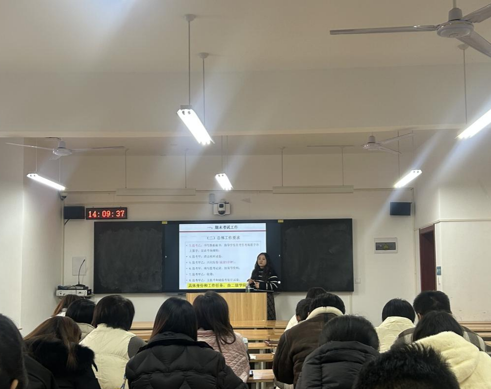 随后,施雨静详细介绍了本次期末考试的时间安排、考场布置、场次、监考人员职责、试卷批改、成绩录入等具体事项,要求全体监考教师严格按照考试规定履行职责,确保考试过程的公正、公平和有序。