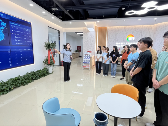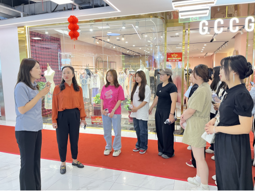 在大观国贸业务总经理郭倩的引领下,师生们共同参观了大观国贸项目推介中心,深入了解了企业的发展历程、品牌形象以及独特的企业文化。作为直播行业的领军企业,大观国贸直播基地拥有先进的5G技术设备和丰富的服装资源,为学生们提供了一个难得的机会去亲身感受直播行业的蓬勃发展和创新动力。