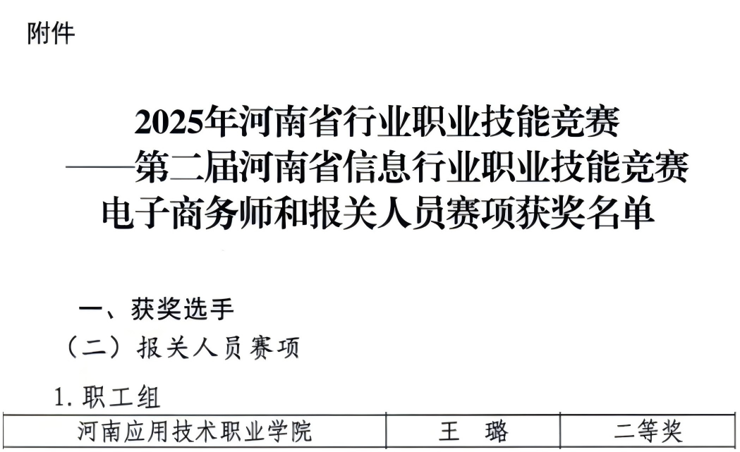 12月12日,第二届河南省信息行业职业技能竞赛报关人员赛项圆满落幕,Beat365中文官方网站教师王璐凭借扎实的专业素养和稳定的临场表现,在职工组竞赛中脱颖而出,斩获二等奖。