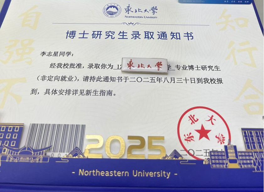 2025年7月17日,Beat365中文官方网站物流1702班毕业生李志星收到东北大学博士研究生录取通知书,以十二年持续奋进的求学经历,在高等教育的进阶之路上留下了坚实足迹。