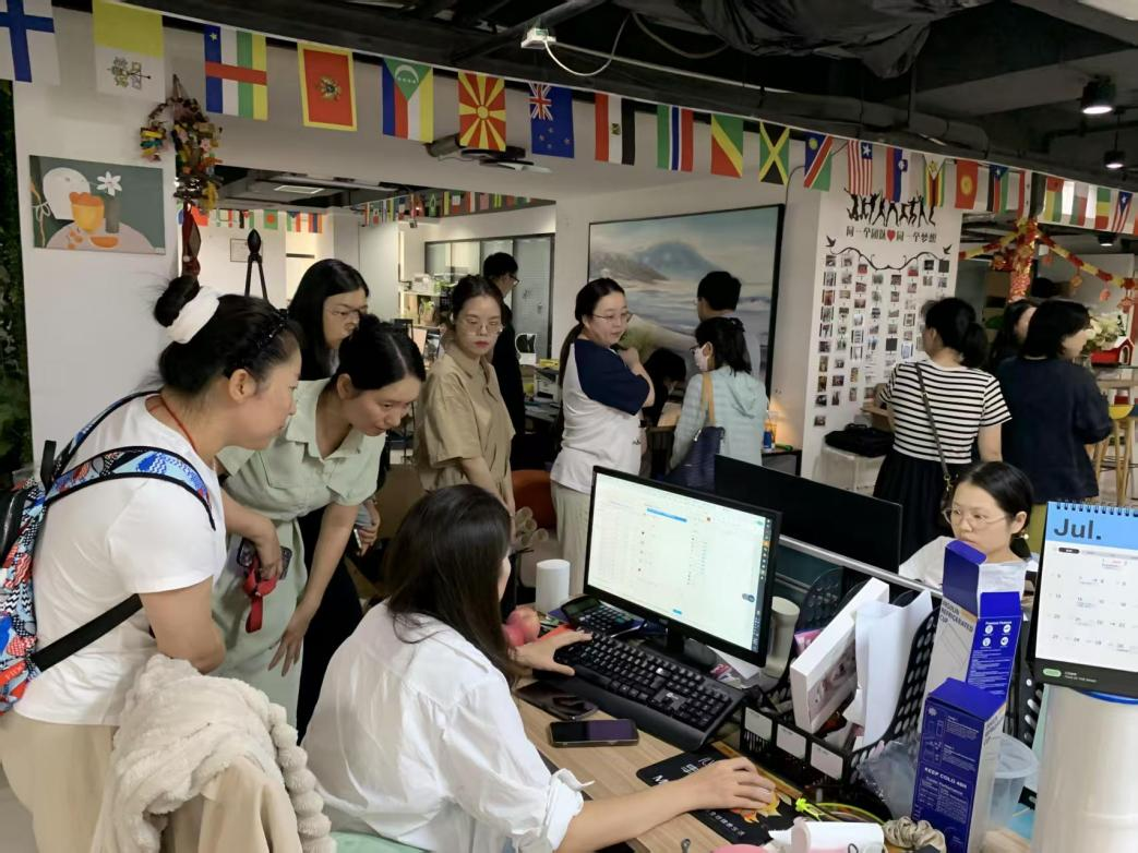 在参观过程中,乐橙网络科技有限公司的工作人员热情接待了骨干教师培训学员。他们首先带领培训学员参观了公司的办公区域,展示了现代化的办公环境与高效的工作流程。学员们饶有兴致地观看了员工们如何通过数据分析、市场调研等手段精准把握全球市场动态,从而制定营销策略。