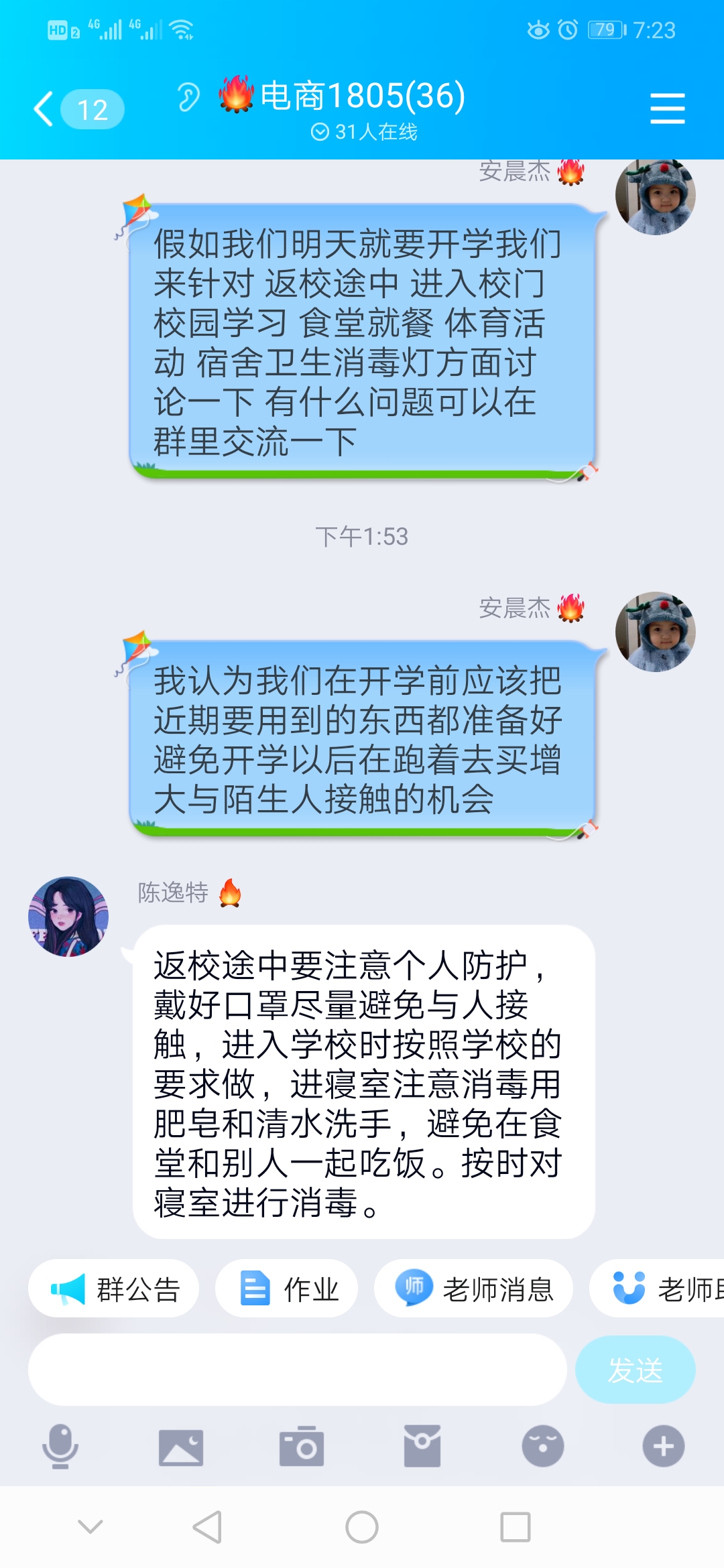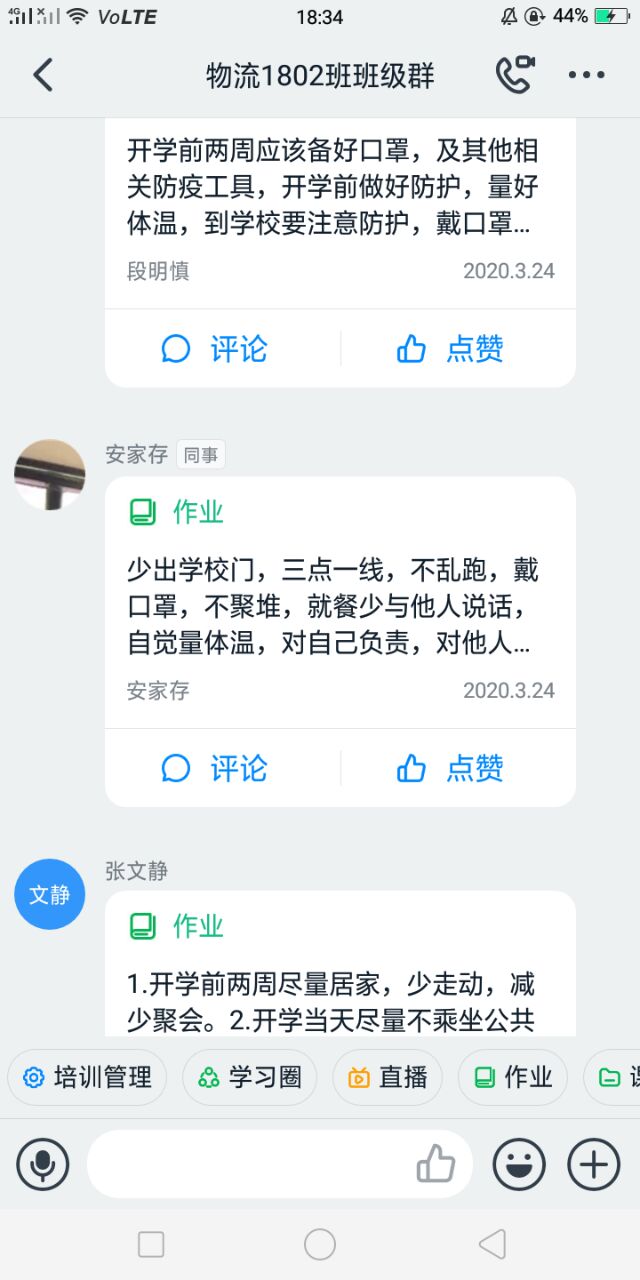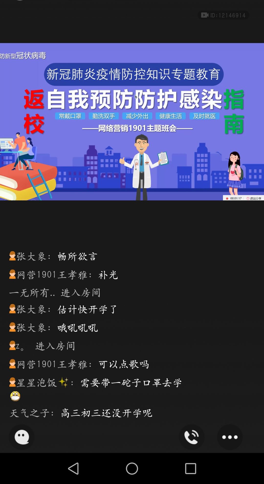 辅导员老师利用钉钉、腾讯课堂、QQ等网络工具组织学生观看了“疫情防控科普知识” 讲座视频和科普小视频,同学们针对返校途中、进入校门、校园学习、食堂就餐,体育活动、宿 舍卫生消毒等方面如何做好防疫工作进行了热烈的讨论。