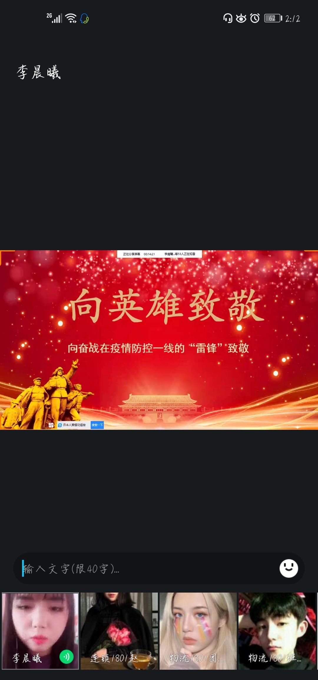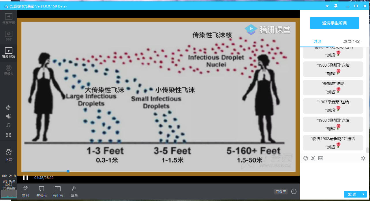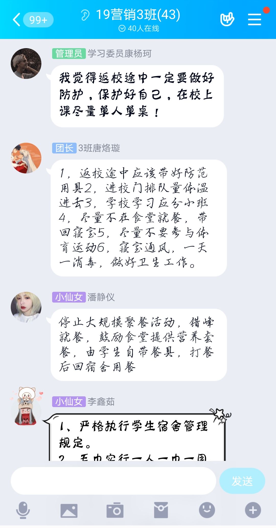 辅导员老师利用钉钉、腾讯课堂、QQ等网络工具组织学生观看了“疫情防控科普知识” 讲座视频和科普小视频,同学们针对返校途中、进入校门、校园学习、食堂就餐,体育活动、宿 舍卫生消毒等方面如何做好防疫工作进行了热烈的讨论。
