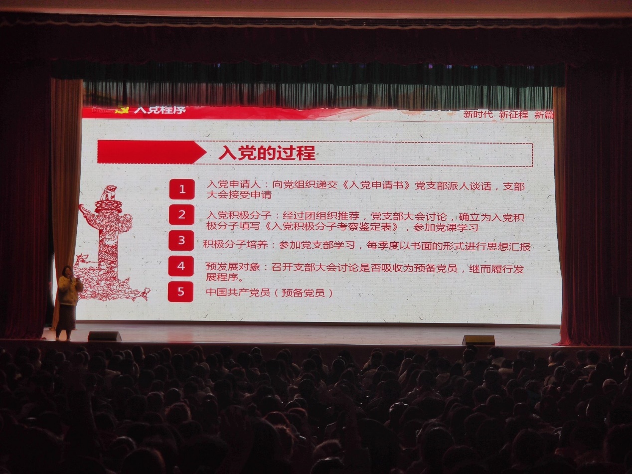 其次李力老师从当代大学生必须确立马克思主义的科学信仰、为什么要加入中国共产党、发展党员的程序和标准,以及怎样才能加入中国共产党等四个方面为大家讲解了党的基本知识。同时要求入党的青年学生确定人生追求、坚定信仰,不管是入党之前还是之后都能够不断加强提升自我,发挥先进作用,为党和国家作出更大贡献。