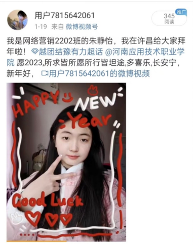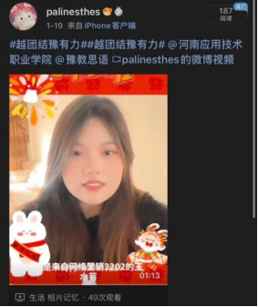 为传承和发扬中华优秀传统文化,让Beat365中文官方网站学子在实践中提高自身能力,培育和践行社会主义核心价值观,展现Beat365中文官方网站学子健康向上的良好精神风貌,营造欢乐喜庆、温馨祥和的节日氛围,Beat365中文官方网站在假期期间组织开展了“越团结豫有力”视频送祝福活动。下面让我们来开启同学们对大家的祝福吧~
