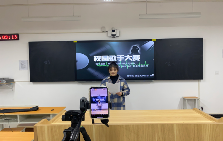 通过层层选拔,终于来到了激动人心的决赛现场,在校园歌手大赛决赛直播间内,经过主持人一系列的开场白和气氛渲染,参赛选手们感受并接收到直播间同学们的期待和热情。