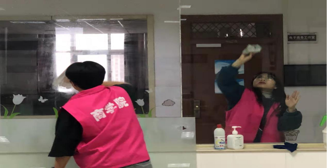 志愿者擦拭实训室玻璃,力求做到窗明几净