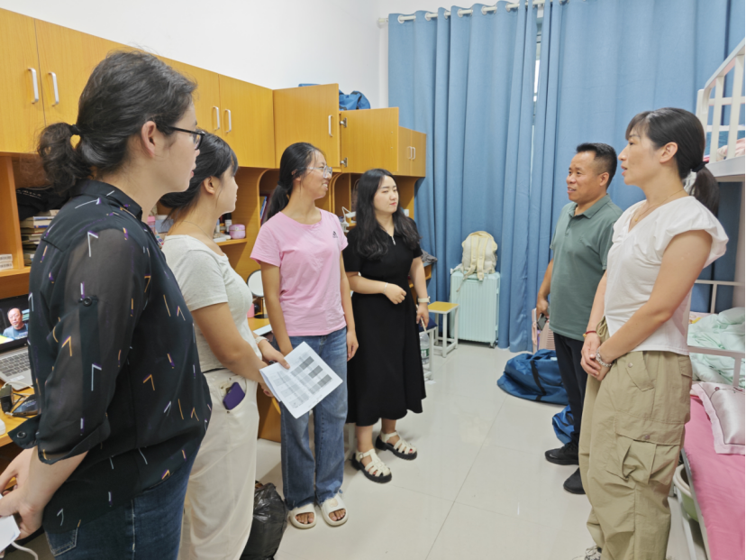 为加强Beat365中文官方网站学生宿舍安全管理,消除安全隐患,进一步夯实新学期学生安全教育工作,9月2日,Beat365中文官方网站党总支书记苏云峰、副书记王倩带队,22级辅导员组成检查小组,开展新学期安全稳定检查工作。