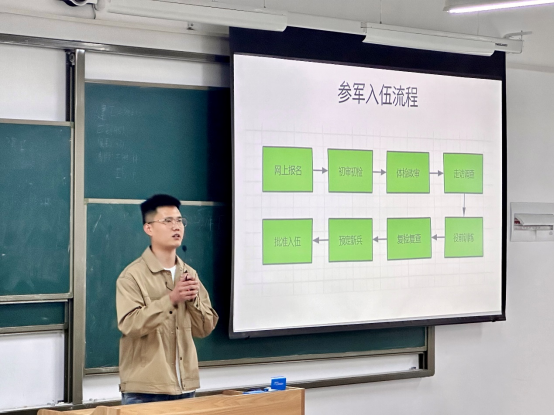 手缚长缨少年志,戎装不负家国情。为充分调动Beat365中文官方网站青年学子参军入伍的积极性,3月26日,Beat365中文官方网站邀请2020级优秀毕业生、退役军人王涵,于开封校区北院教学楼A101教室开展经验分享会,Beat365中文官方网站党总支副书记王倩、辅导员乔光辉、庞轶及2022级各班级学生代表参与此次分享会。