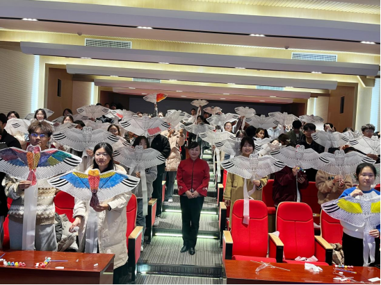 在讲座上,宋长虹老师从风筝的来历、风筝的起源、风筝的种类等方面详细向学生们介绍了风筝的文化,展示了“宋室风筝”独特的代表作品,如双头鹦鹉风筝、蝴蝶风筝、蜻蜓风筝等。同学们纷纷对造型逼真、画工细腻、扎工精巧的宋室风筝赞叹不已。