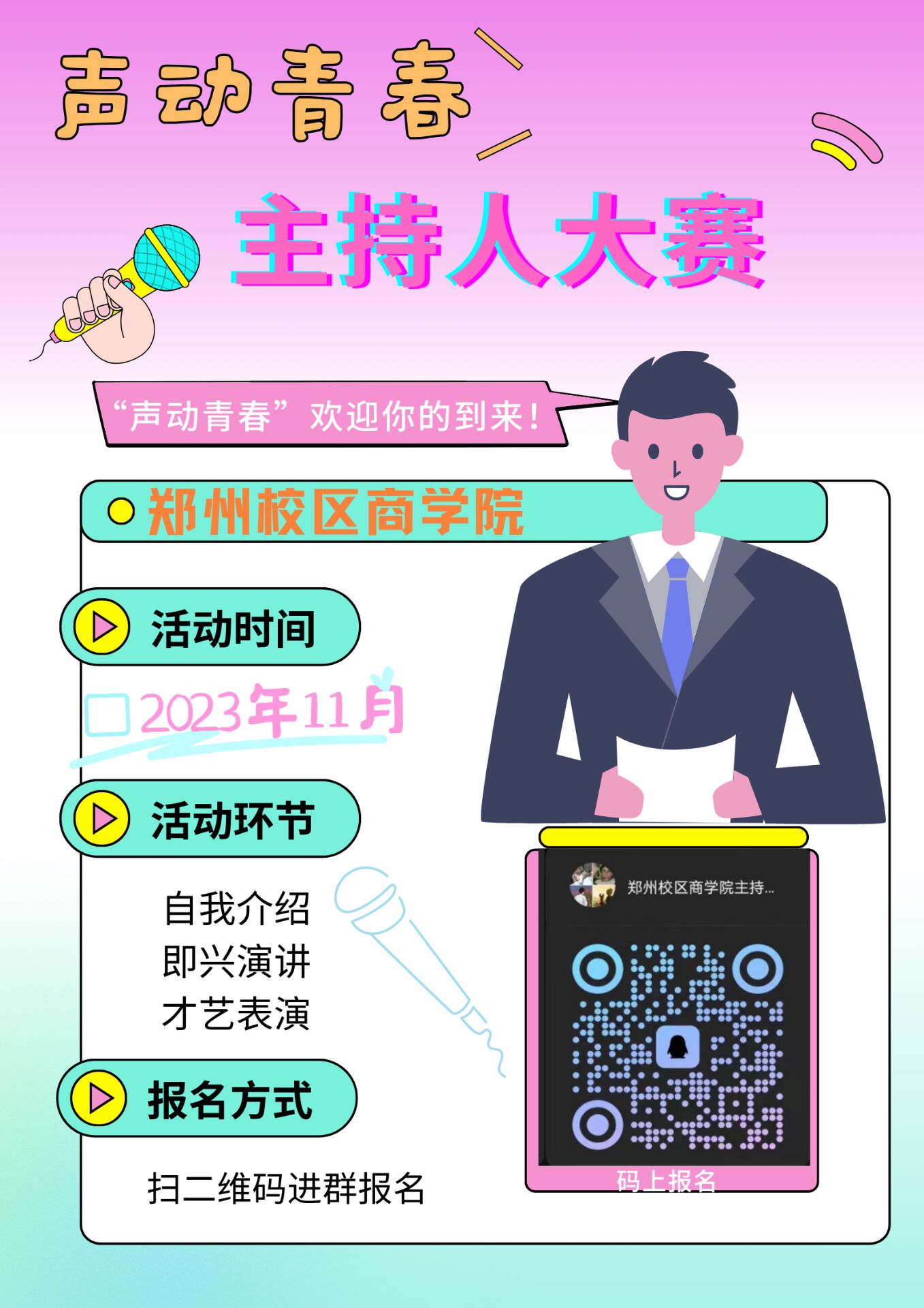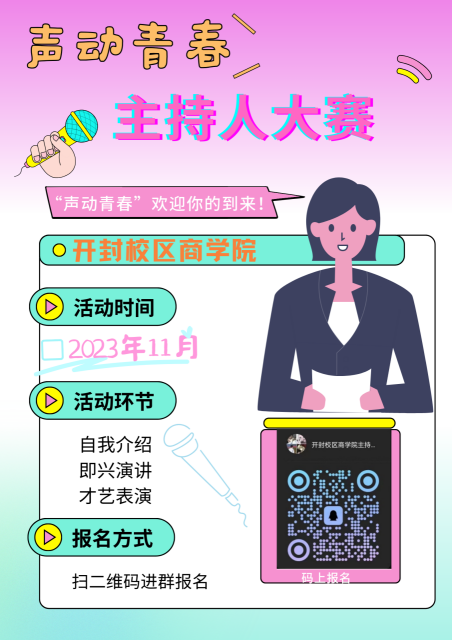 声音传递梦想,舞台精彩绽放。为丰富校园文化生活,搭建具有时代特征、青年特点的大学生校园科技艺术活动平台,激励大学生坚定理想信念,厚植家国情怀,本次活动旨在为学生提供展示才华与锻炼主持和语言表达能力的平台,促进校园文化艺术的发展,作为同学们展示自我的舞台。