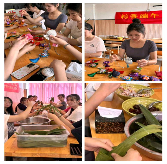 包粽子和制作香囊是端午节的传统习俗之一,其技艺传承已久。同学们分成小组,一组准备了糯米、红枣、豆沙等食材,以及粽叶、绳子等工具。他们手法娴熟,动作迅速,大家一边包粽子,一边交流情感,欢声笑语一片融洽和谐。另一组则沉浸在制作香囊的快乐中,制作香囊不仅是一种技艺,更是一种对美好生活的向往,同时香囊寓意着驱邪避疫、祈福安康。