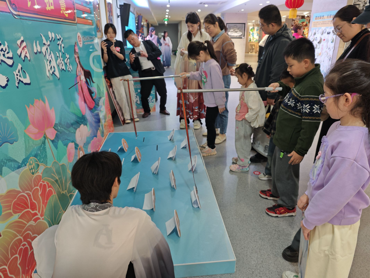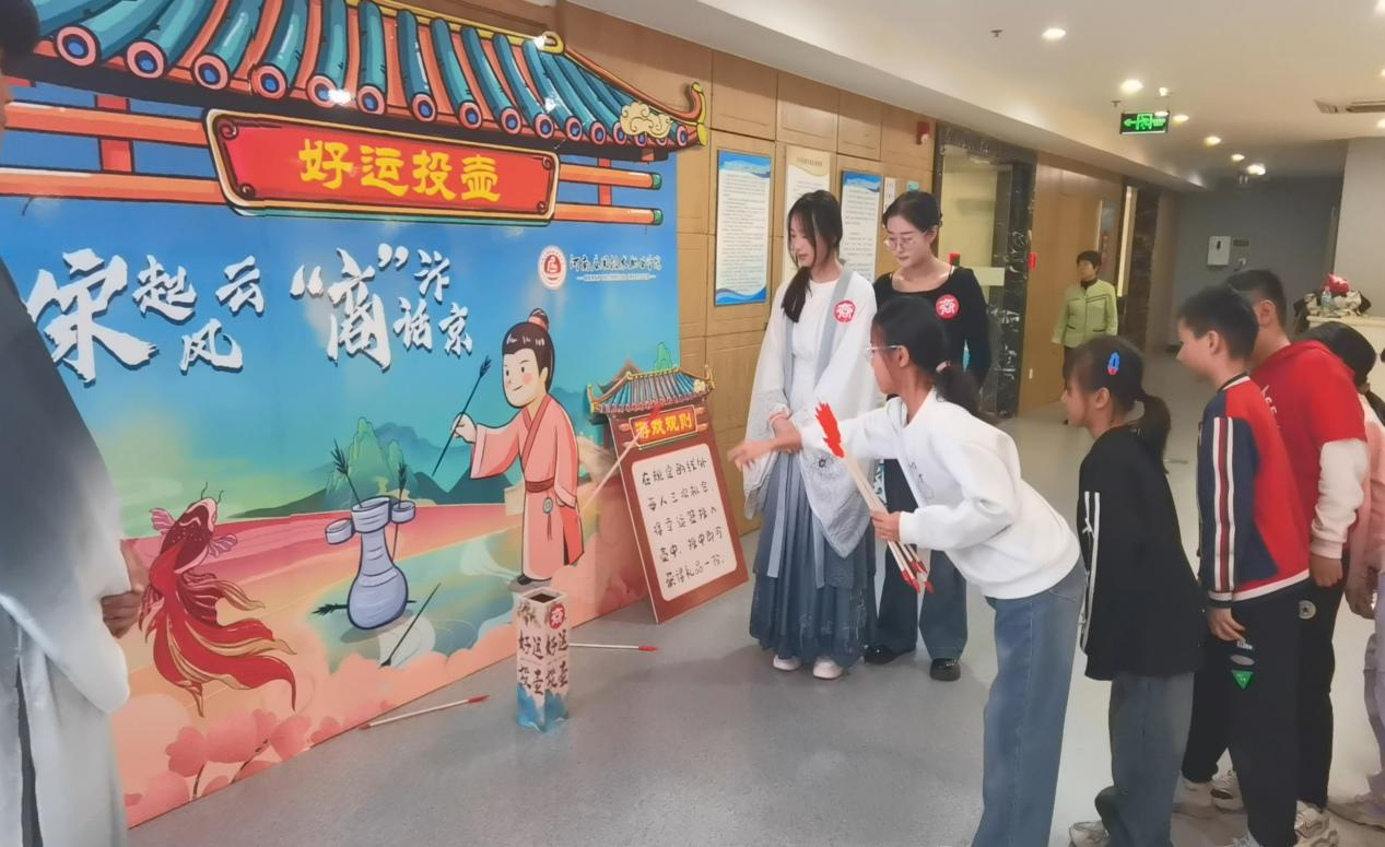 活动现场,负责活动的同学们身穿宋服,仿佛穿越千年,将人们带回到了那个繁华的宋朝。“蹴鞠” 游戏中,参与者们尽情挥洒汗水,感受着古代体育运动的魅力;“好运投壶”则考验着大家的技巧与耐心,现场欢声笑语不断;“钓如意”游戏主要考验参与者对宋诗宋词的了解,更是激发了人们对传统文化的热爱,中小学生们踊跃参与,展示出扎实的诗词功底。