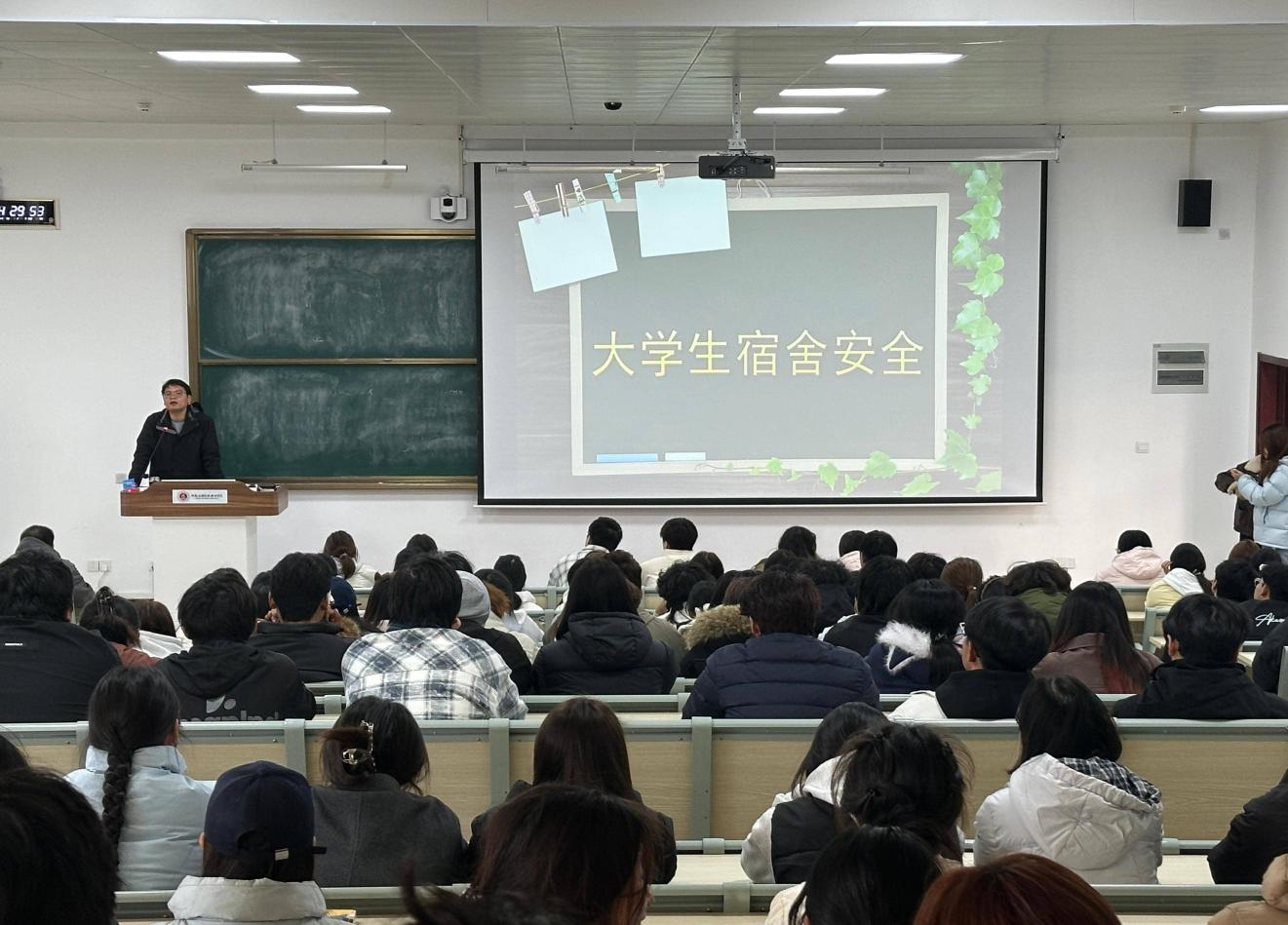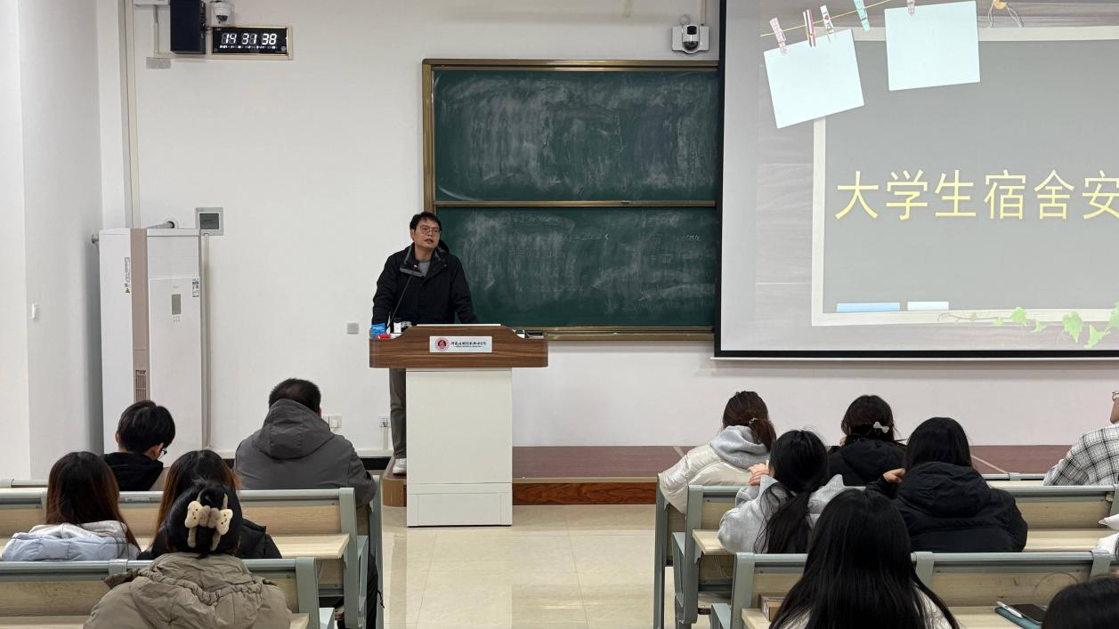 宣传会上,乔光辉结合高校宿舍特点与真实案例,为同学们进行了详细的讲解。他首先通过展示近年来部分高校发生的宿舍火灾案例影像与数据分析,以触目惊心的事实,深刻揭示了违规使用大功率电器、私拉乱接电线、电器使用不当、堆放易燃物品、堵塞消防通道等行为的巨大危害。真实的案例警示着在座的每一位同学,火灾隐患并不遥远,消防安全必须时刻谨记。