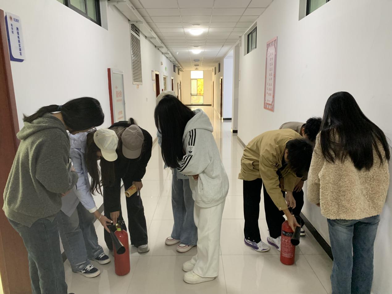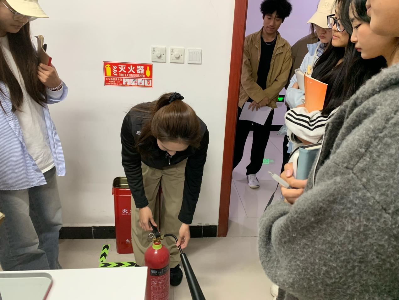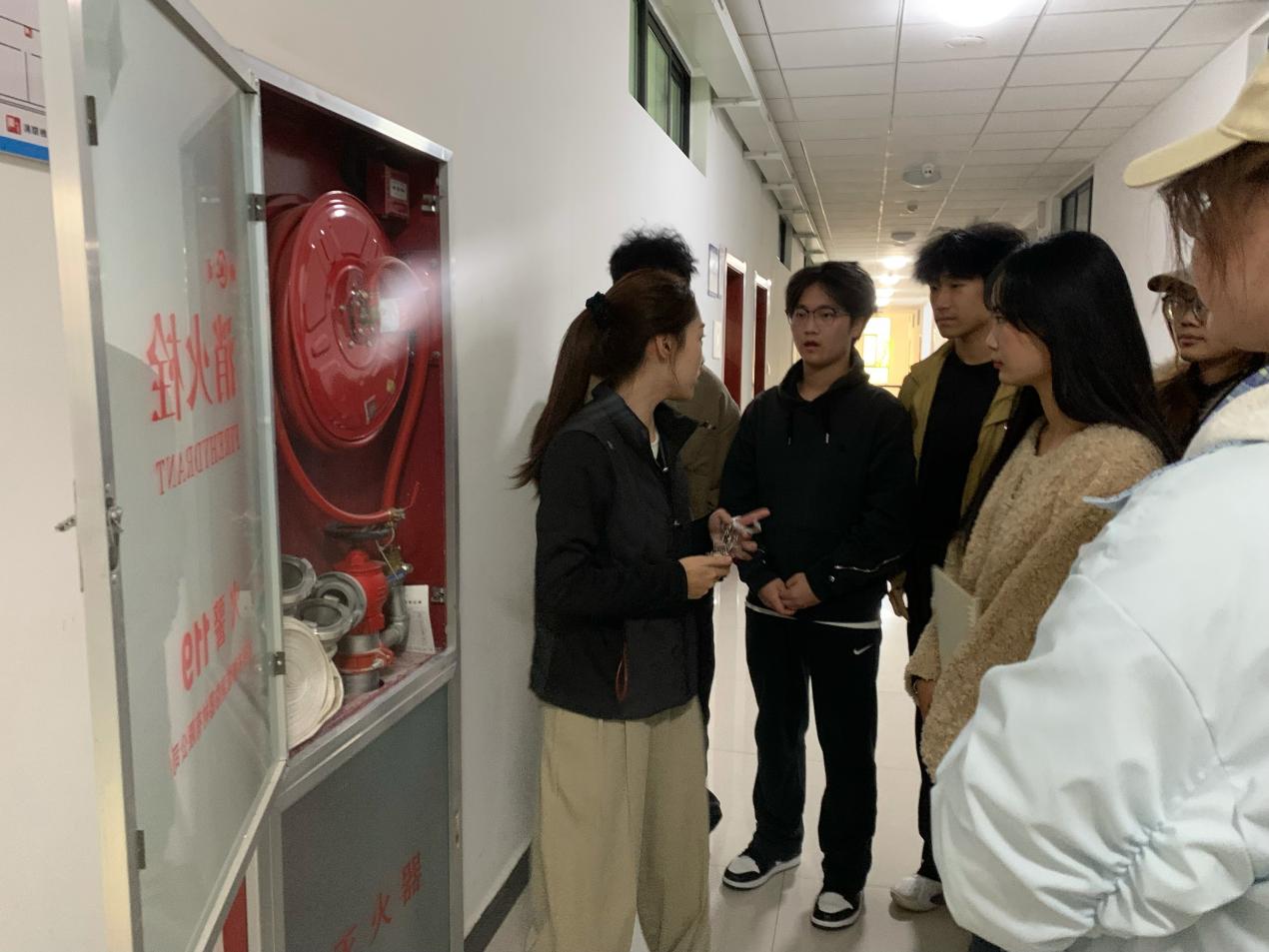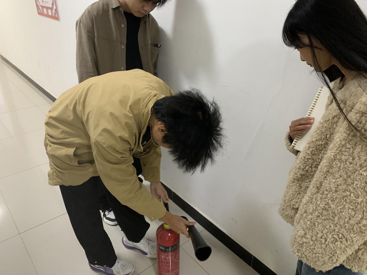 活动现场,同学们先后走进物流仿真实训室、直播间、电子商务沙盘实训室等教学场地,围绕不同场地的消防风险点、特殊消防注意事项,以及灭火器、消火栓等器材的基础使用知识展开学习,深刻领会“预防先行”“小火会灭”“大火会逃”的消防核心要义;随后在实训室管理员带领下,大家实地查看Beat365中文官方网站实训教室各楼层及楼梯间灭火装备,管理员同步详细讲解墙壁消火栓、应急灭火箱的功能作用及消防水带的存放位置与取用规范,并组织学生分组开展灭火器实操练习——从提握灭火器的正确姿势、保险销的拔除方法,到对准火源根部按压喷射的操作要点,管理员全程逐项示范、反复强调规范,引导学生树立消防实战意识,确保每位同学都能熟练掌握操作技巧,切实将“小火会灭”的技能落到实处。