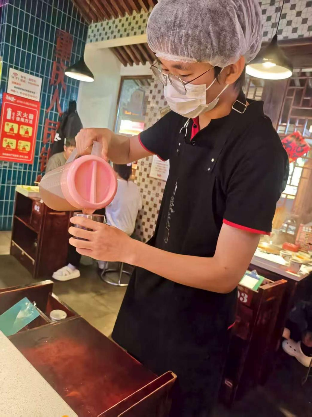 高峰期最考验人,中午和晚上的饭点,十几桌客人同时叫服务是常事。有次同时接了三桌单,传菜时差点把毛肚送错桌,幸好同事及时提醒。后来学会提前记桌号、分批次回应需求,渐渐能从容应对。后厨师傅们的专注也感染了我。他们炒锅底时,牛油和辣椒的比例分毫不差;备菜时,毛肚切得厚薄均匀。他们常说“火锅要够味,服务要够暖”,这让我明白,不管做什么,认真才能做好。看到客人把卤味泡进红汤、把甜品吃得精光,会觉得特别满足。这段日子,我不仅学会了高效沟通,更懂了“服务”的本质——不是机械完成流程,而是主动体谅。现在路过卤校长,闻到那股熟悉的牛油香,就会想起那些忙碌又温暖的瞬间,这大概就是这个暑假最实在的收获。