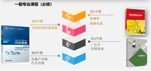 具有市场营销、品牌推广、销售管理、消费者行为学、数字营销技术、推销技术、商务谈判、市场调查与预测等专业核心课程,以及管理学、市场营销技能训练、广告学、营销策划、房地产营销、汽车营销、中国商贸文化、商务礼仪、经济学基础、经济法等一般专业课程。