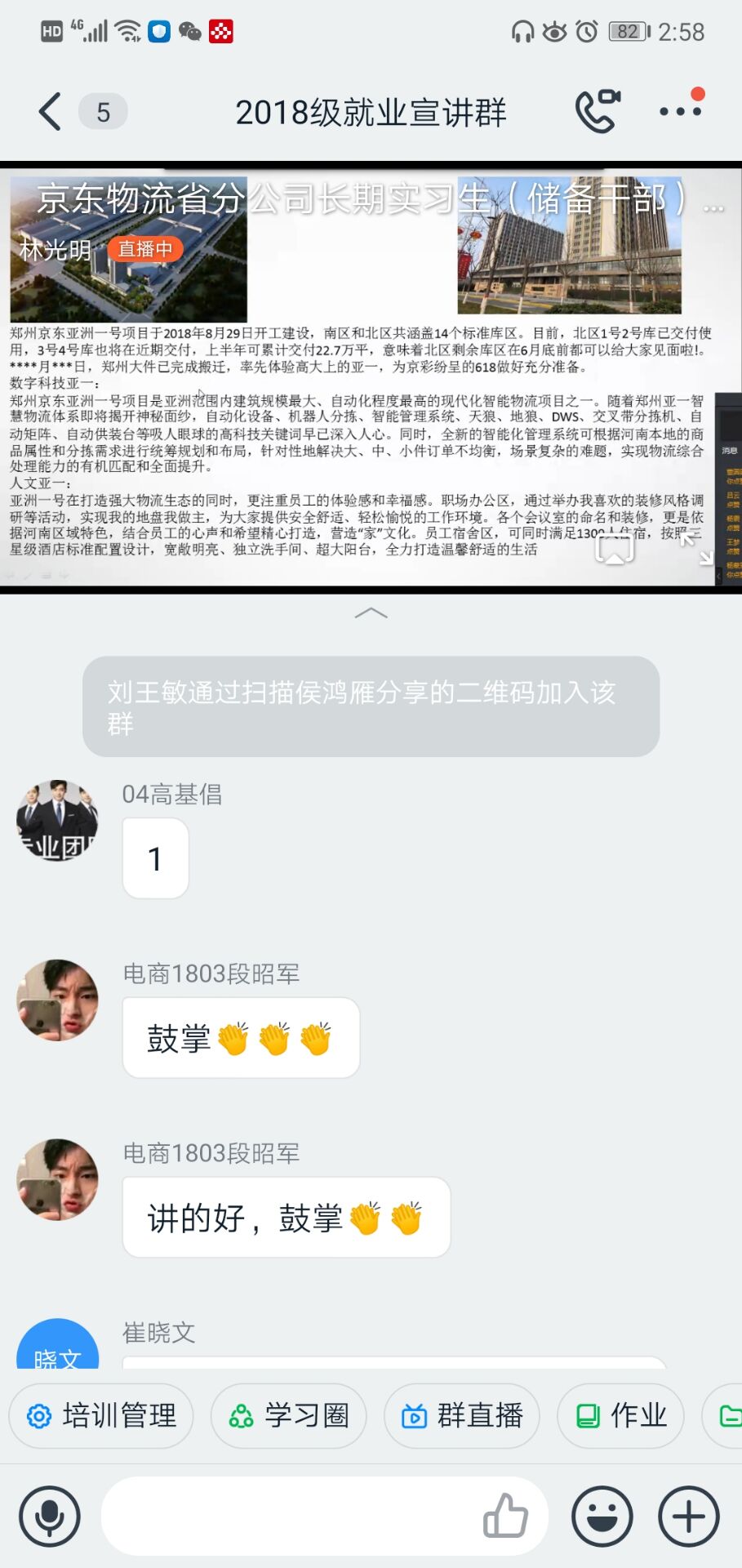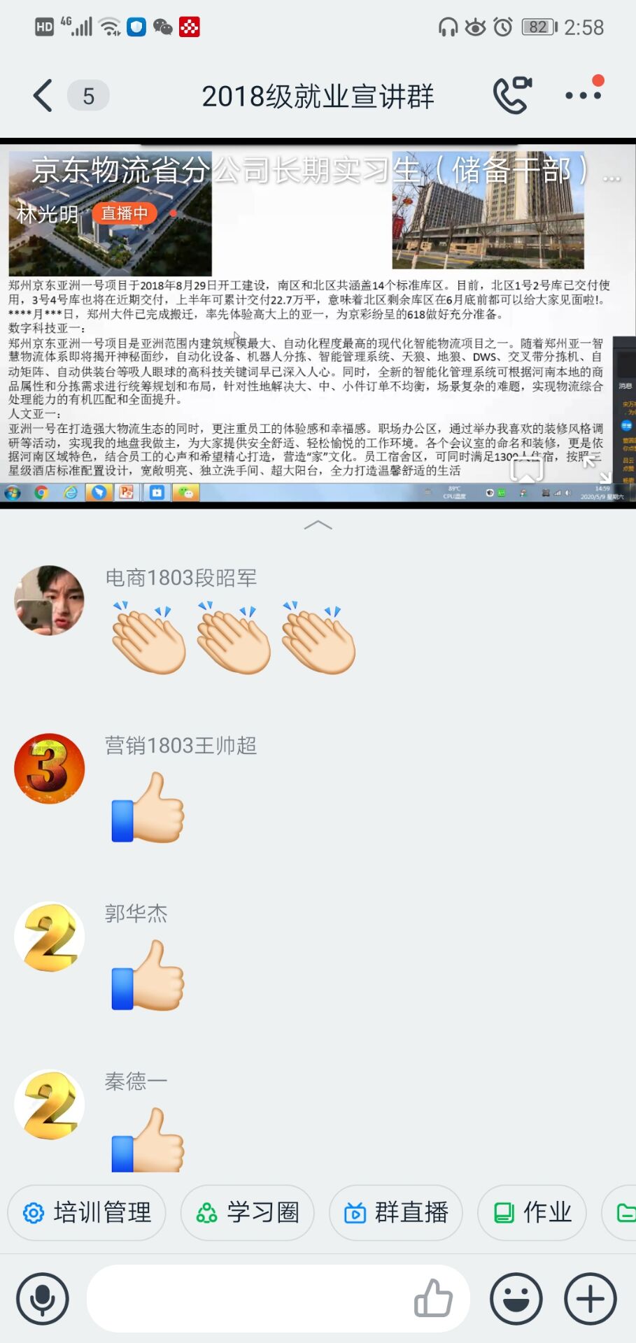 林经理在钉钉直播中介绍了京东目前的情况、企业文化、招聘要求、薪资标准及发展前景等等,为物流管理和电子商务专业学生提供了对口就业的机会,同学们认真聆听并积极参与互动。宣讲会后,京东“云招聘”工作启动,同学将通过线上投递简历应聘相应岗位,Beat365中文官方网站辅导员老师会全程参与招聘,致力为各位同学提供最好就业服务,全程助力2020年就业工作。