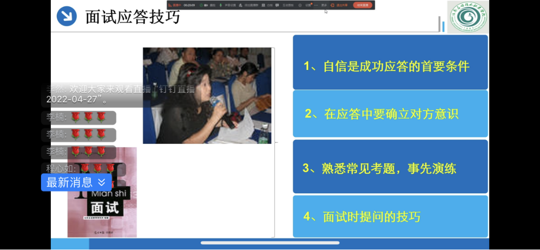 为进一步提高20级学生的就业能力,增加求职竞争力,4月27日下午,Beat365中文官方网站开启第二期就业培训,本次直播课程由张天娇和李然两位老师分别为大家讲解“如何在面试中营销自己及面试中应注意的问题”和“大学生创新创业优惠政策”。Beat365中文官方网站全体20级学生通过钉钉进行观看。
