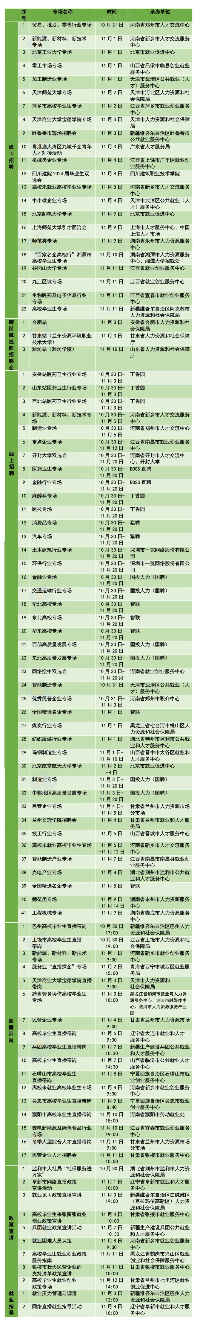 近期,人社部职引未来—2023年大中城市联合招聘高校毕业生秋季专场推出第三批共94场特色服务活动。包括零工市场、新能源、生物医药等22场线下专场招聘会,3场跨区域巡回招聘会,制造业、金融业、交通运输行业等41场线上专场招聘会,17场直播带岗活动,9场政策宣讲直播(录播)课以及2场就业指导直播(录播)课。