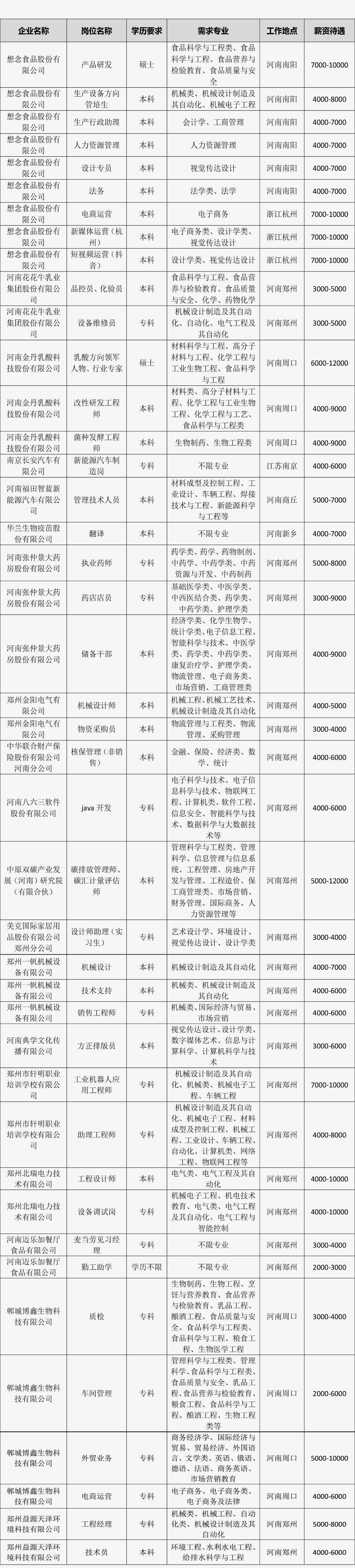 截至目前,想念食品股份有限公司、河南花花牛乳业集团股份有限公司、河南金丹乳酸科技股份有限公司、南京长安汽车有限公司、郑州金阳电气有限公司、中华联合财产保险股份有限公司河南分公司、河南八六三软件股份有限公司等60余家企业已报名参会,提供岗位近4000个,涉及互联网、教育、医疗、金融、生产制造、食品服务及新媒体等行业。用人单位持续报名中......部分职位详情如下: